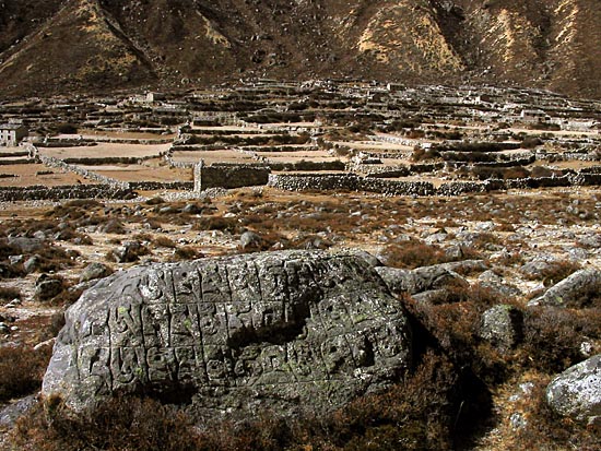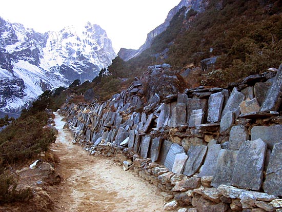 a long mani wall lines the trail to the Thame gompa
