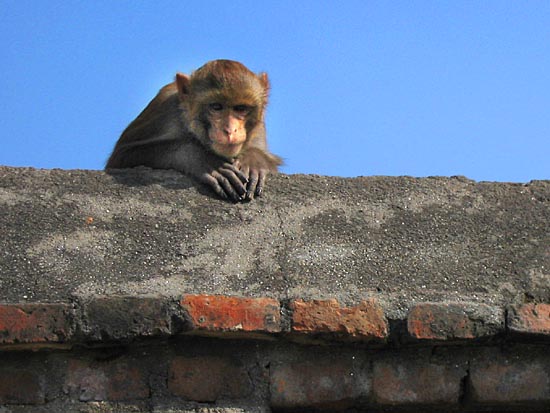 this little monkey was peeping over a wall along the Bagmati