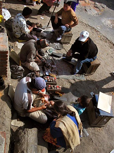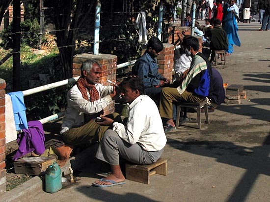 the northwestern end of the Patan Bridge, these makeshift barber shops are
