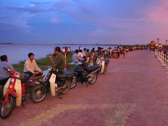 On the day I arrived in Phnom Penh... an evening stroll along the western bank of the Mekong at it's confluence with the Tonle Sap and Bassac Rivers. Making the most of the recently constructed riverside promenade, the locals enjoying an idyllic lifestyle in this rustic ancient city. |