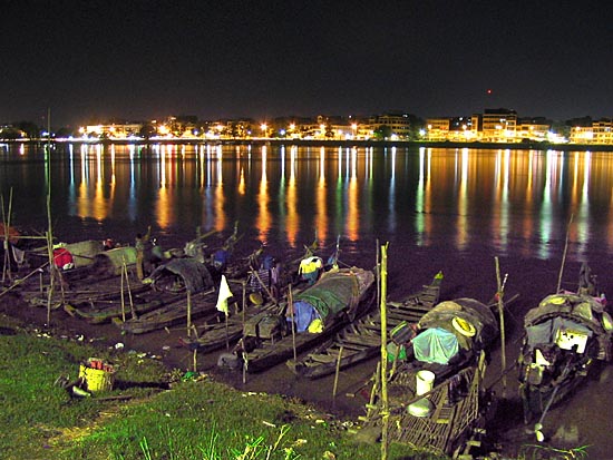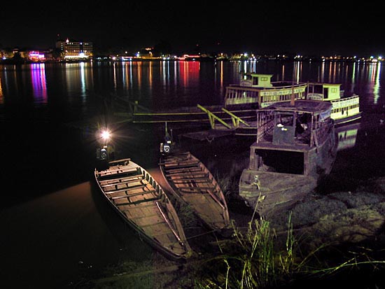 The bright lights of Phnom Penh's riverside of pubs, restaurants and karaoke night clubs. Loud music reverbs across the river as the occupants of the boat houses sleep. |