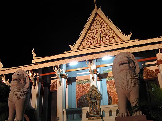 Lighted up like a Christmas tree, the stupa of Wat Phnom is a prominent feature of Phnom Penh's night lights. In the recent past when the park was not lighted, the traffic circle on which Wat Phnom is located was a prime place for armed robbery in the night. |