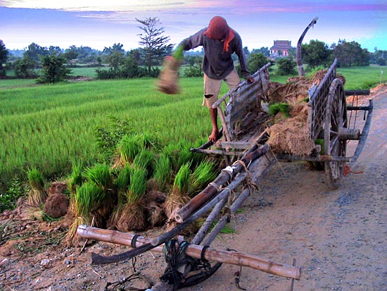 The southern banks of Tonle Bati is the site where the ancient temple of Ta Prohm is situated, some 33 km south of Phnom Penh. The journey there is via National Highway 2, a road of relatively good condition permitting speeds in excess of 100 km/h at some sections. The usual paddies line both side of the highway. This man was unloading the rice stalks for the new planting crop season. |