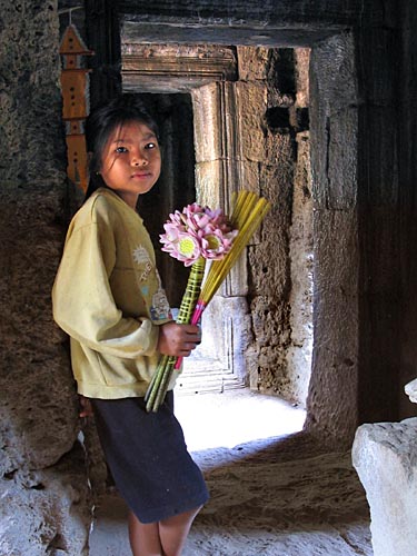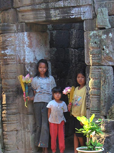 As with all tourist attractions, touts are the norm, These young girls were trying to sell vistors joss sticks and lotus flowers for prayers. |