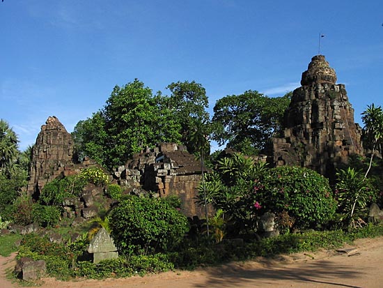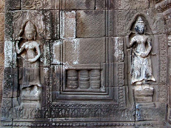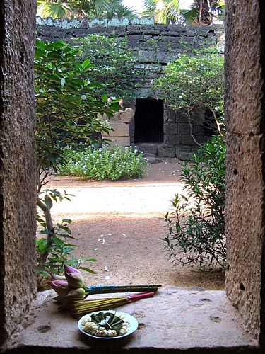 The Angkor-era temple of Ta Prohm was bulit by King Jayavarman VII (reigned 1181 to 1201) on the site of a 6th century Khmer shrine. Made of laterite, the temple has a main sanctuary consisting of five chambers. |