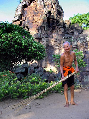 The temple caretaker goes about his morning duties of keeping the grounds tidy. |
