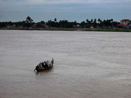 Traffic on the Tonle Sap is not very heavy here. A lone fishing boat drifts along. The opposite bank is connected to Phnom Penh city via the Cambodian-Japanese Friendship Bridge |