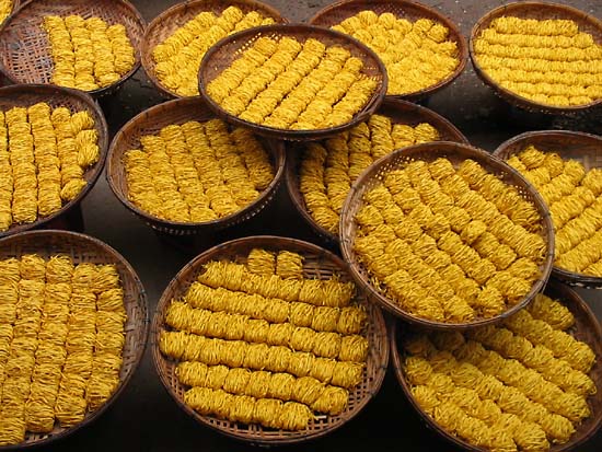 The local version of tar mee poh... made by a cottage industry, dozens of these baskets of noodles line the roadside to be dried. |
