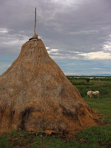 Many haystacks dot the rural roadside, some of them in shapes of a perfect hut. |
