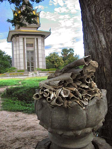 43 of the 129 communal graves have been left untouched. The bowl of bones sit under a Chankiri tree, against which children were beaten and killed by the executioners. |