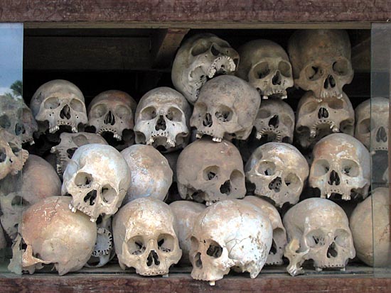 Over 8,000 of the exhumed skull remains, arranged by sex and age, are kept behind glass panels in the Memorial Stupa erected in 1988. Most of those executed were killed with a shovel or axe blow to the back of the neck to avoid wasting precious bullets. |
