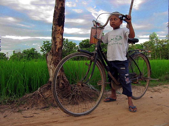 A small boy on a big bike. He too was going to school holding a plastic bag for his text book. |