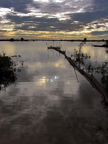 Many fishing traps reach out into the lake from the banks. Fishermen were preparing for a long day out. |