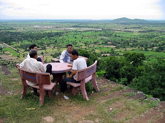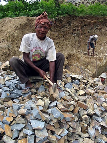 the northern slopes of Phnom Chisor are active granite quarries. Men and