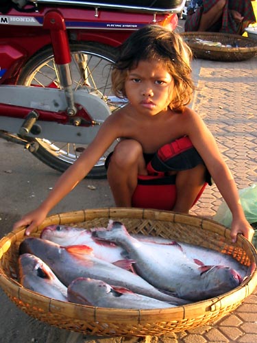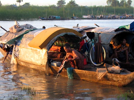 Morning has broken over the Bassac. The fisherman's houseboats have moored along shore to bring in the previous night's catch for sale in the markets. |