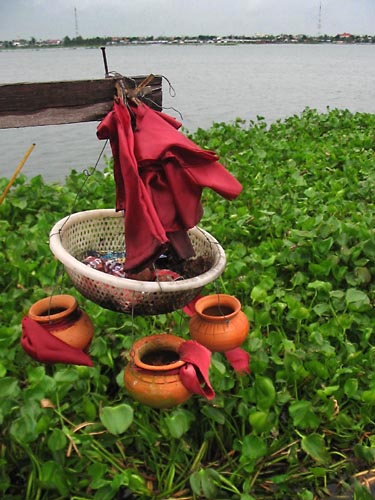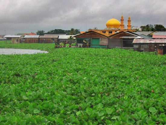 A rainy morning at Boeung Kak Lake.. Much of the fringe of the lake is overgrown with hyacinths. The view is northwards from the newly opened Smiles Guesthouse, with a striking glimpse of the roof and minaret of the International Mosque. |