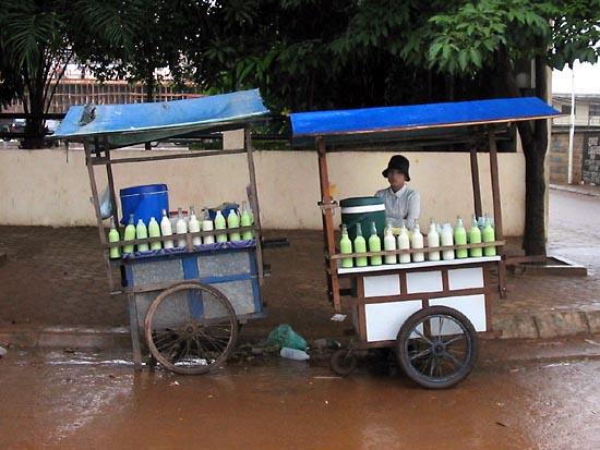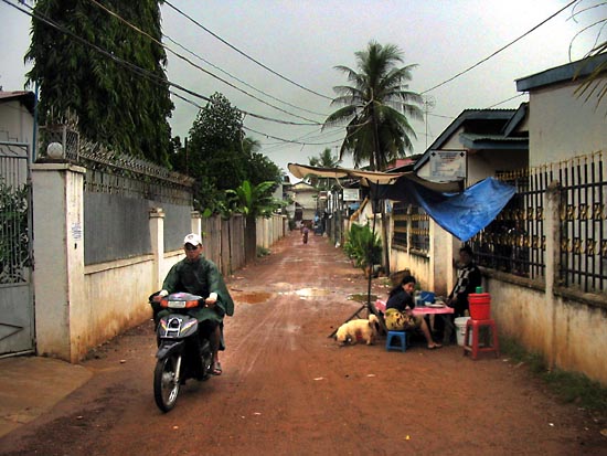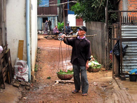 Exploring the streets around Boeung Kak Lake is very difficult by car, especially more so in a Mercedes Benz. The narrow streets leave little room for errors. The man is selling rice noodles. |