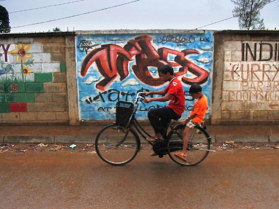 The walls line the street are tastefully graffitied with colourful advertisements of guesthouses, cheap cafes and tattoo shops. |