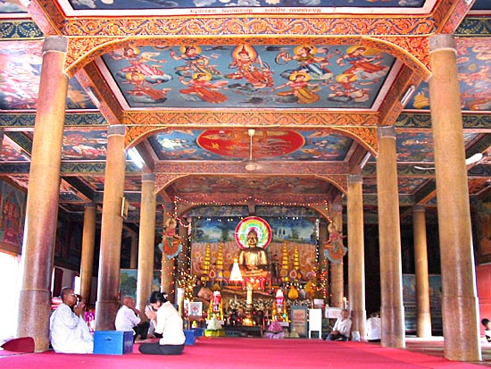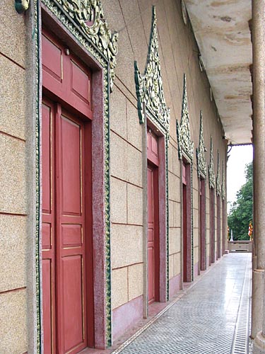 It is a colourful temple with plenty of new paint and young monks in bright orange saffron robes strolling around. It was the second of Phnom Penh's wats to be repaired by the post-1979 government. The chambers of the vihara have been newly painted with scenes from the life of Buddha. |