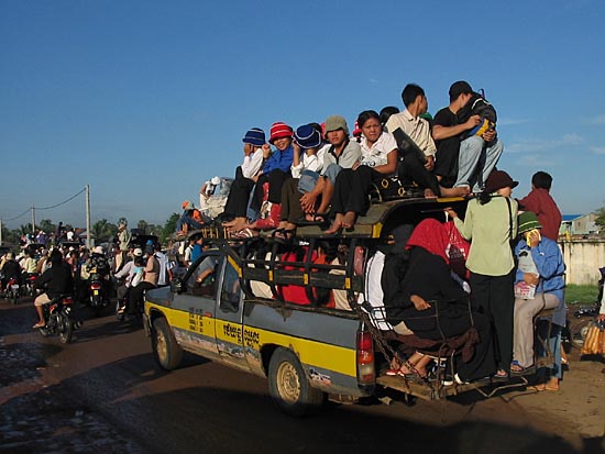 Everybody seems to be rushing home to cerebrate the Chum Ben. Just 11 km outside of Phnom Penh, Chom Chau is an important taxi terminus where people can board these overloaded pickup taxis that ply National Highway 3 towards the south... to Takeo and Kampot. |