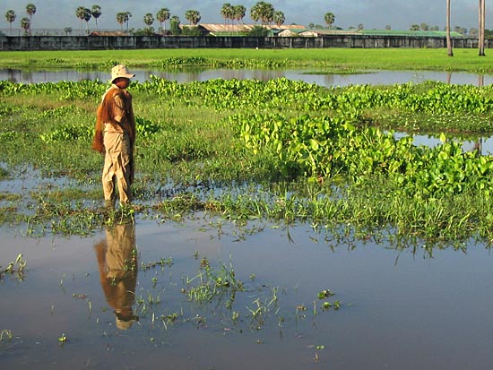 A fisherman patiently awaits for a subtle sign to indicate a potential catch. This small flood plain was just off Highway 3 not far from Chom Chau. |