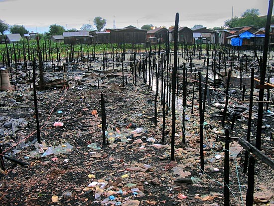 The slums of Phnom Penh are fire hazards. Built of very combustible materials, a small fire would spread to the whole neighbourhood in no time. A few hundred people lost their homes in a recent fire along Rue 132. The firemen upon arriving at the fire scene refused to put out the fire till the home owners paid them some money. Now what's left are charred stilts, and it has also become a garbage yard. |