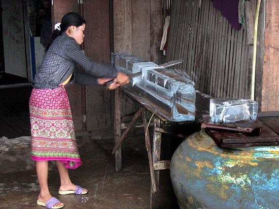 Backyard industries are common to sustain a living. This family freezes water from the nearby Boeng Kak Lake to make ice, then cutting them into blocks for sale. |