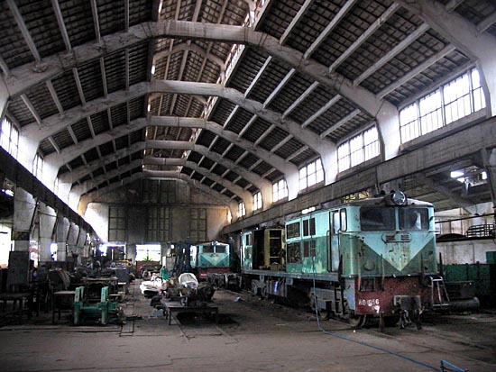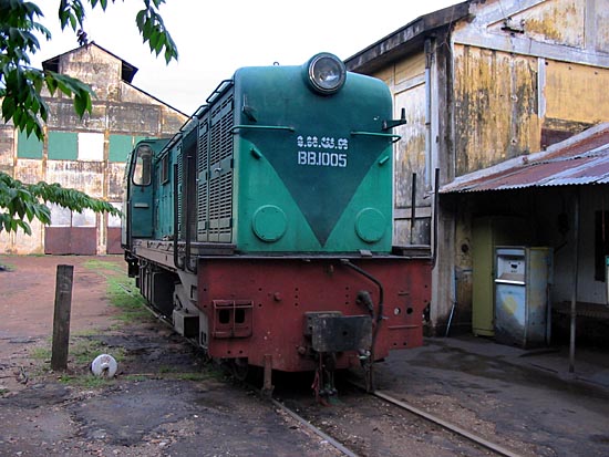 One of the mainline diesel engines. The old dilapidated building behind is the very much still in service repair workshop for the railway. |