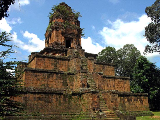 The name of this temple derives from a legend in which the king fled during an attack on Angkor and was saved from being caught by the enemy when a large bird swooped down and spread its wings to shelter him. This was the first temple-mountain at Angkor built entirely of durable materials, of brick and laterite with sandstone decorations. |