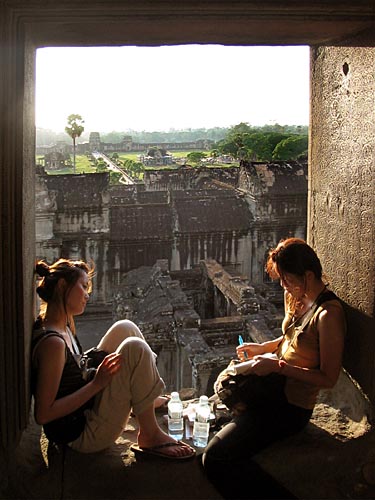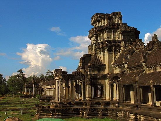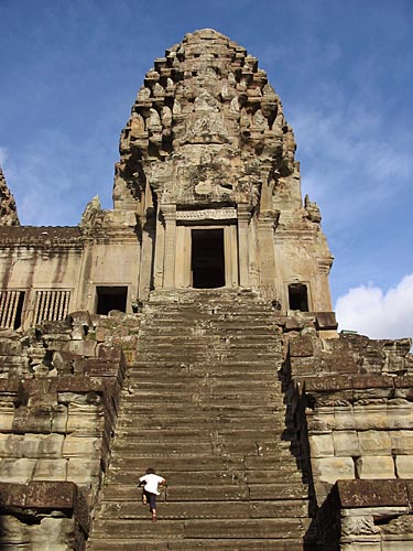 From a distance, Angkor Wat appears to be a colossal mass of stone on one level with a long causeway leading to the centre. But on close up, it is a series of elevated towers, covered galleries, chambers, porches and courtyards on different levels linked by stairways. |
