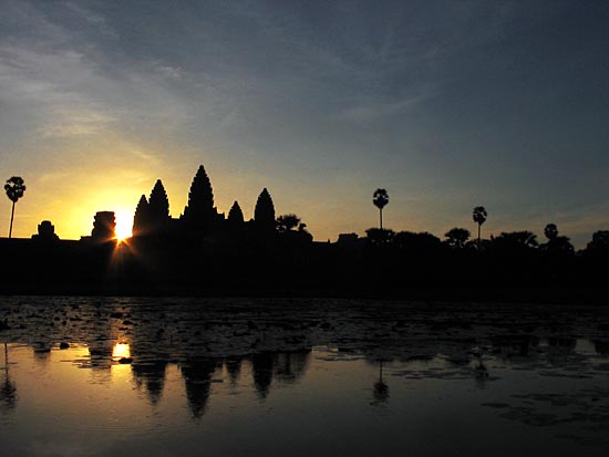 The northern reflecting pool in front is the premier sunrise location. The sun will rise behind the temple providing a silhouette of the distinctively shaped towers against a coloured morning sky. |
