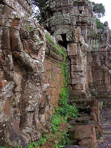 On either sides of the gopura, sandstone garudas stand guard, along with the nagas that they hold. The are symbolic protectors of the air and water. 68 of them are placed approximately 35 metres apart around the outer enclosure wall serve as the mythical guardians of Preah Khan. |