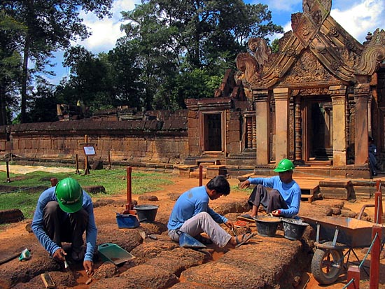 Banteay Srey is the first temple at Angkor to have been completely restored by the process of anastylosis. This was a method of reconstructing monuments with the original materials used and in keeping with the original form of the structure. |