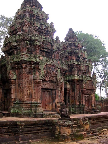 The tenth century temple of Banteay Srey is renowned for its intricate decorations carved in pinkish sandstone. |