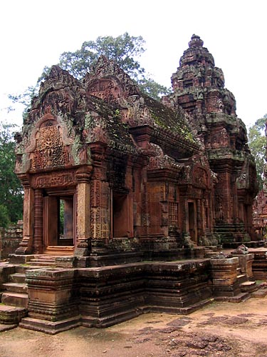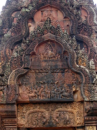The architecture and decoration here is closer to that of Indian models than any other temple at Angkor. One special feature of the exquisite decoration was the use of a hard pink sandstone (quartz arenite) which enabled the technique of sandalwood carving on stone. |