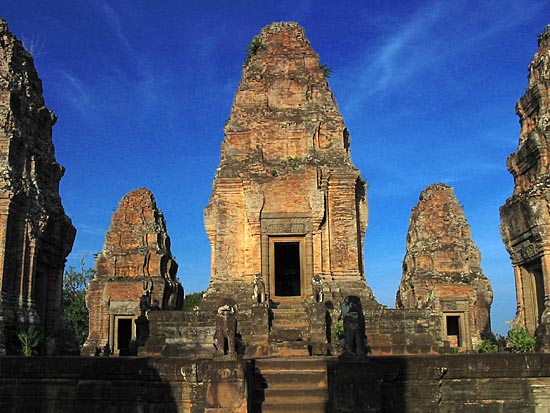 This temple once stood on a small island in the middle of the Eastern Baray, and its only access was by boat. Today the baray is dry and access is straightforward. East Mebon is a temple mountain symbolising Mount Meru with five towers in quincunx atop a platform of three diminishing tiers. |