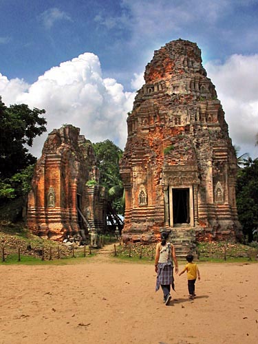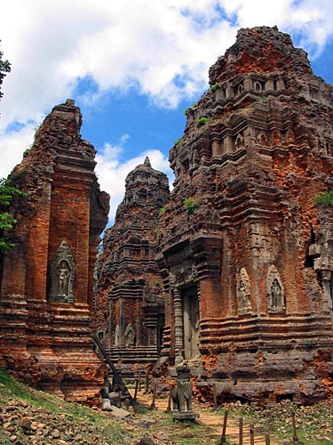 An island-temple consisting of four brick towers on a double laterite platform. The temples were located in the center of the first large-scale baray constructed by a Khmer king. |