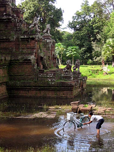 Washing bicycle in the moat. This young lady makes most of the wet season's abundance. |