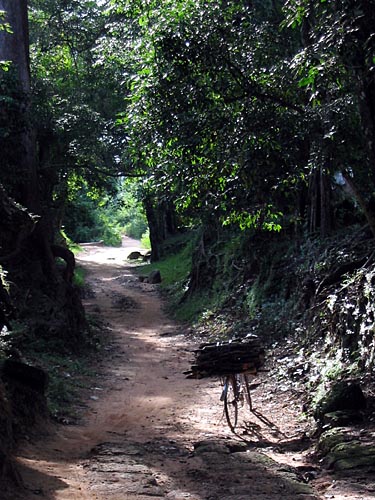 An unattended bicycle loaded with firewood collected from the nearby forest stands along the unsealed path that leads west beyond Angkor Thom towards the Western Baray. |