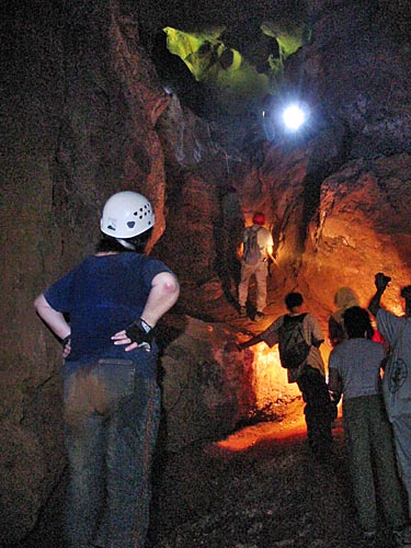 taking our turns to climb up to the higher chamber with the aid of a rope