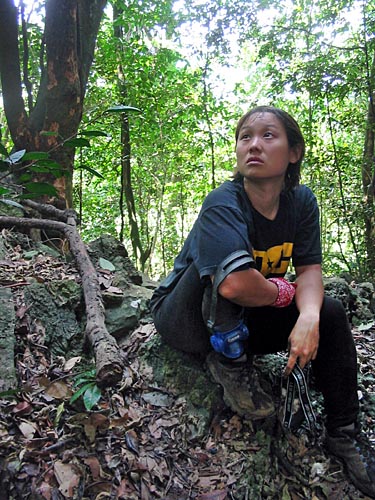 Kiat Hong looking worried as she watches her beau free climb on the limestone