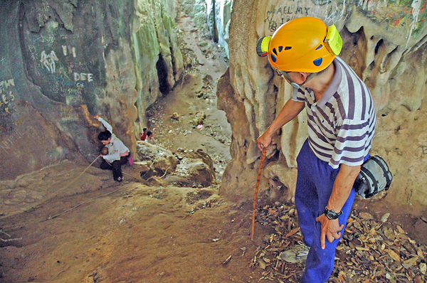 climbing up from the lower to the higher chamber up a precariously slippery slope