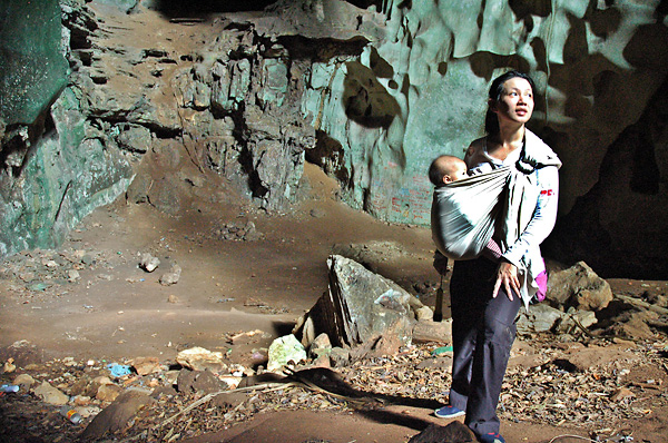 the walls of the cave are green with algae growth, as these thrive well under the very low light conditions