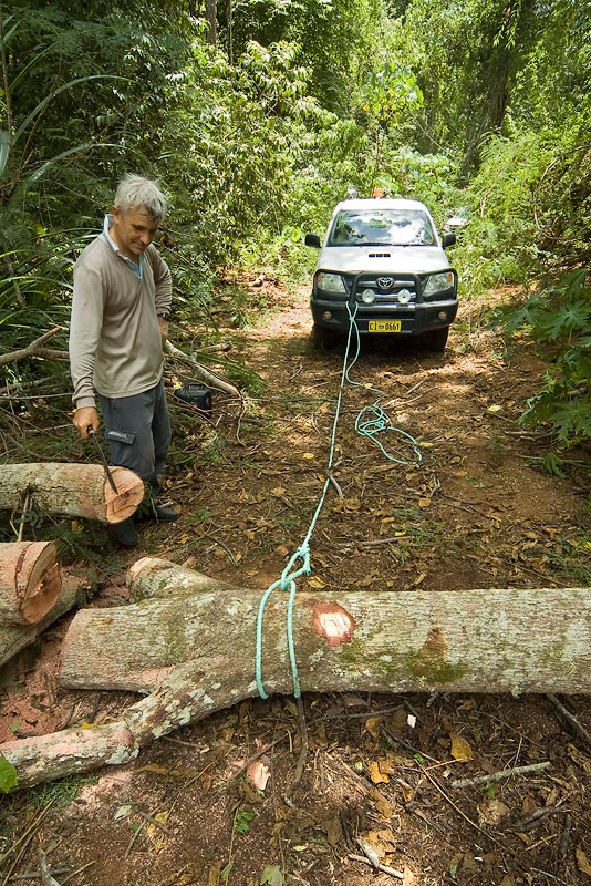 | our convoy of two Toyota Hilux and team of four, armed with a chainsaw and parangs set out to conquer the difficult track to Hosnie's Springs; clearing the initial boggy sections of the track with no problems, we next encountered a series of fallen trees that requires lots of hard work | |||||