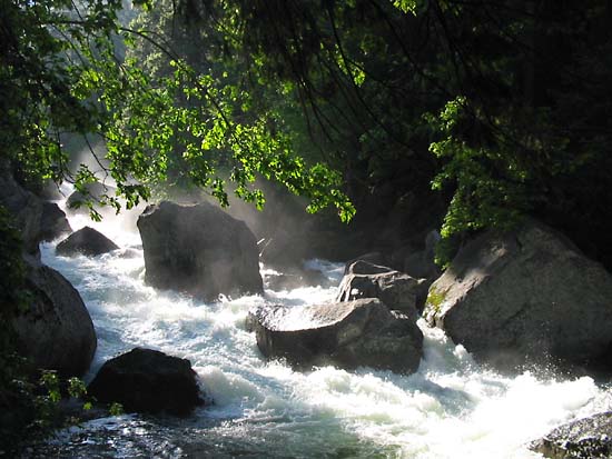 The initial portion of the trail to Half Dome follows the Merced River. The river is violent along this section, with many thundering rapids and breathtaking waterfalls.