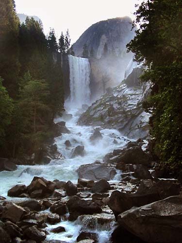 | A vertical drop of 317 feet, Vernal Falls is the first of two high waterfalls along the trail to Half Dome. Just beyond is Mist Trail, a steep trail that sprays hikers with Vernal Fall's mist... cooling tired hikers on hot summer afternoons but makes the mostly bedrock route slippery and dangerous. | ||||