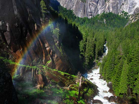 From the top of Vernal Falls is a commanding vista of the Merced River, more than 300 feet below. The spray mist from the falls often provide the droplet nidus for rainbows to form.