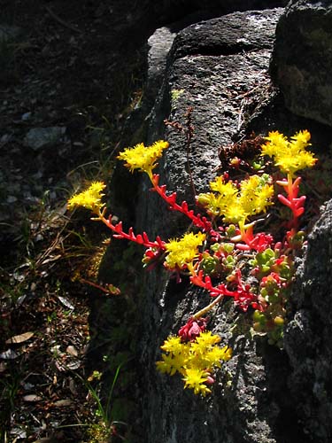 Brilliance in yellow and red, stands out against the dark granite rocks. The trail is a great exhibition of wild flowers... for those who care to stop, look and smell the "roses".
