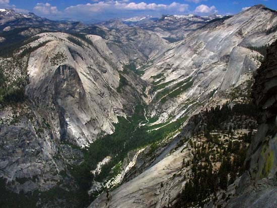 | From the dome's highest point of 8,842 feet, the above is North-East vista is towards the Tenaya Canyon. Snow Creek Falls, Clouds Rest, Quarter Domes can be easily identified. Further beyond, one should be able to see Cathedral Peak, Mount Hoffman, and the Sierra crest. | ||||