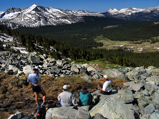 Resting at an boggy sub-alpine pasture, the view beyond shows the Tioga Road and the Sierra crest.